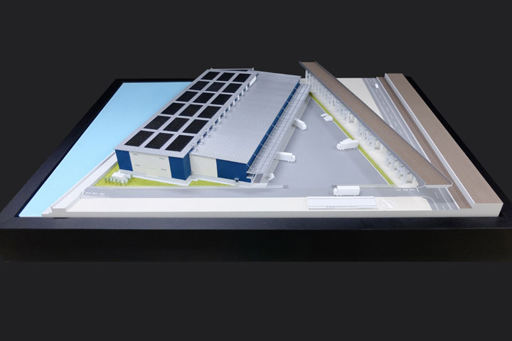 一見したところシンプルな直方体の建物だけですので簡単に思われがちですが、だからこそ屋根の素材の表情やトラックや高架の橋脚などの小物に力を入れて精度を上げています。特に搬入口にはバリカーの表現もプラスしついつい覗き込みたくなる仕上がりになっています。またこのような低層の建物の模型は上から見下ろすことがほとんどですので、倉庫の大きな特徴である大きな庇はより忠実に再現しております。庇を吊っている斜めの構造体は、0.3mmの棒で表現しているんですよ。