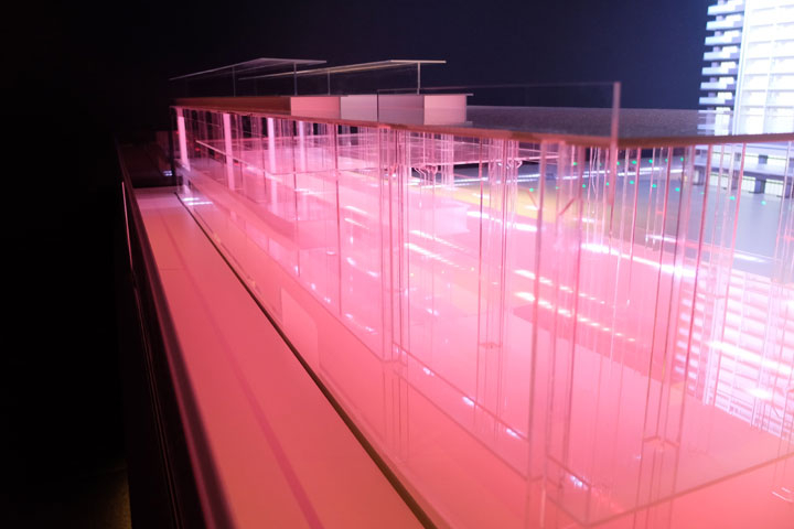 いろいろなギミックを盛り込んでおりますので、モデルルームのシアター映像と連動し動きのある演出を実現しており、来場されたお客様が「あっ!」と驚く展示物になっております。更地の状態の敷地からマンション本体が登場したのち、知立駅は地上駅から高架駅へと変化を遂げます。さらに道路には車の往来を表現したLED照明がところせましと走り抜けます。ぜひ動画をご覧ください。