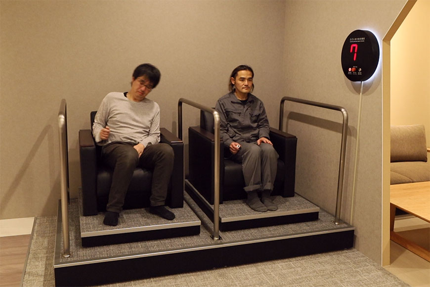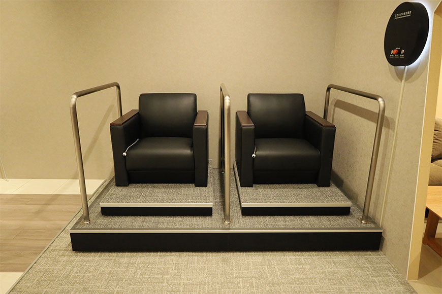 また、安全面にも十分配慮しており、危険を感じた場合にはメインパネルに1か所、さらに各椅子にも1か所ずつ設置された緊急停止スイッチを操作することで、即座に装置の動作を停止することが可能です。安心してご体験いただける仕様となっております。