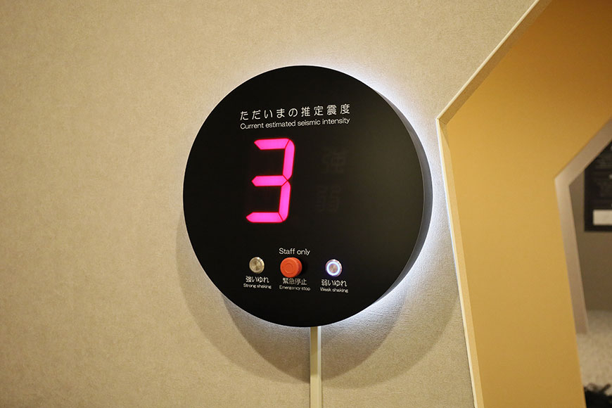 「強い揺れ」と「弱い揺れ」の2つのモードを備えており、それぞれのモードに対して免震機構と耐震機構の揺れの違いを、実際にソファに座った状態で体感することができます。