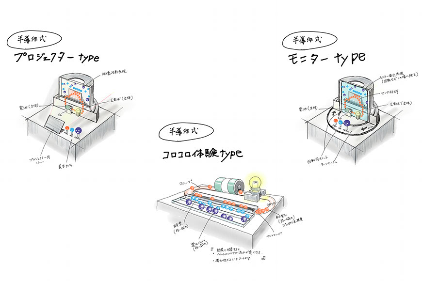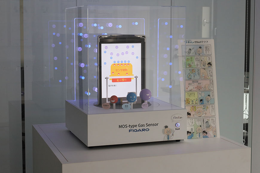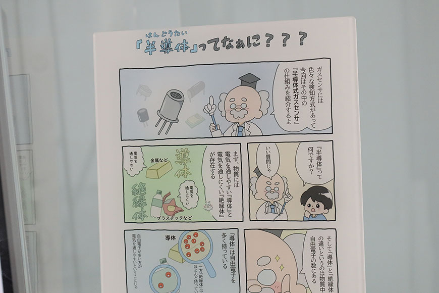 そしてガスセンサの原理を理解したら今度は「半導体とは?」というもっと深部について…。終わりなき学習です。 当初は、この内容を映像として構成し、演目の前半部分でモニターに紹介する案も検討しましたが、説明が長くなることで後半のメイン演目であるガスセンサの解説までに飽きられてしまうことを懸念し、半導体についてはより直感的に理解できる「マンガ」という手法を採用しました。 フィガロ技研様よりご提示いただいた要点をもとに、絵コンテ・カット構成の作成から着色、アクリル板への印刷に至るまで、すべて長谷川模型にて一貫して制作いたしました。なお、マンガ内に登場するキャラクターは、長谷川模型メンバーによるオリジナルデザインです。親しみやすさを加えることで、難解な内容でも楽しみながら理解できる構成としています。