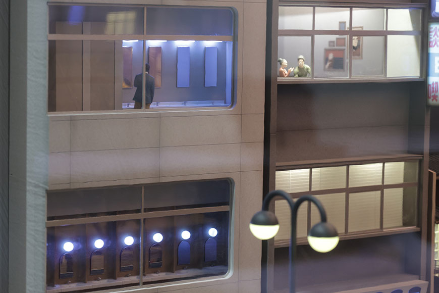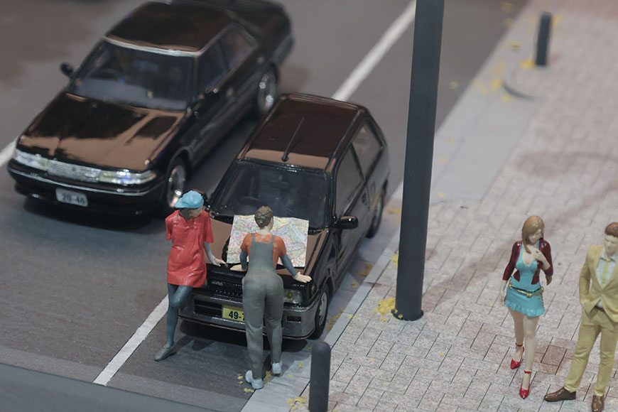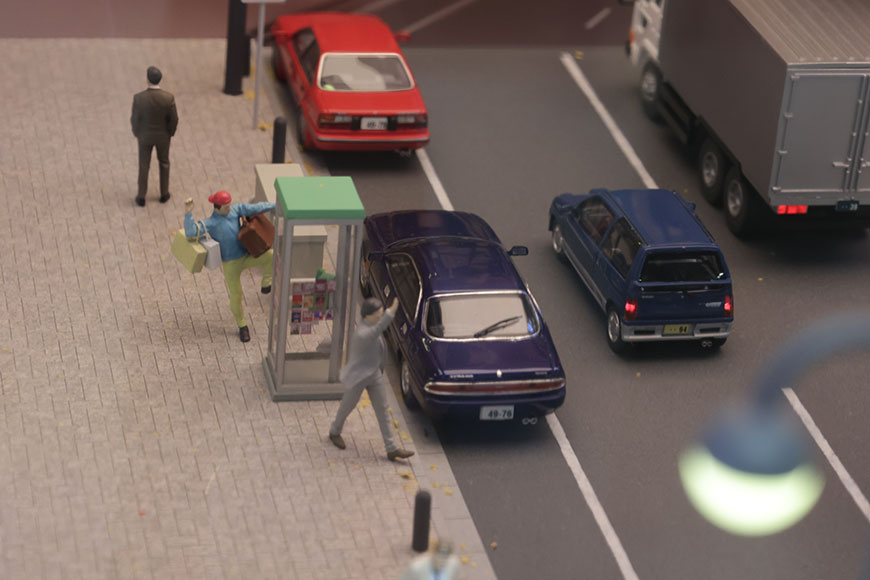 建物や小物はアクリルや3Dプリンターなどですべてオリジナルで一から制作。車両についても、市販品では入手できない約半数をデータ作成・成形・塗装まで行い、当時のディテールを忠実に再現しました。