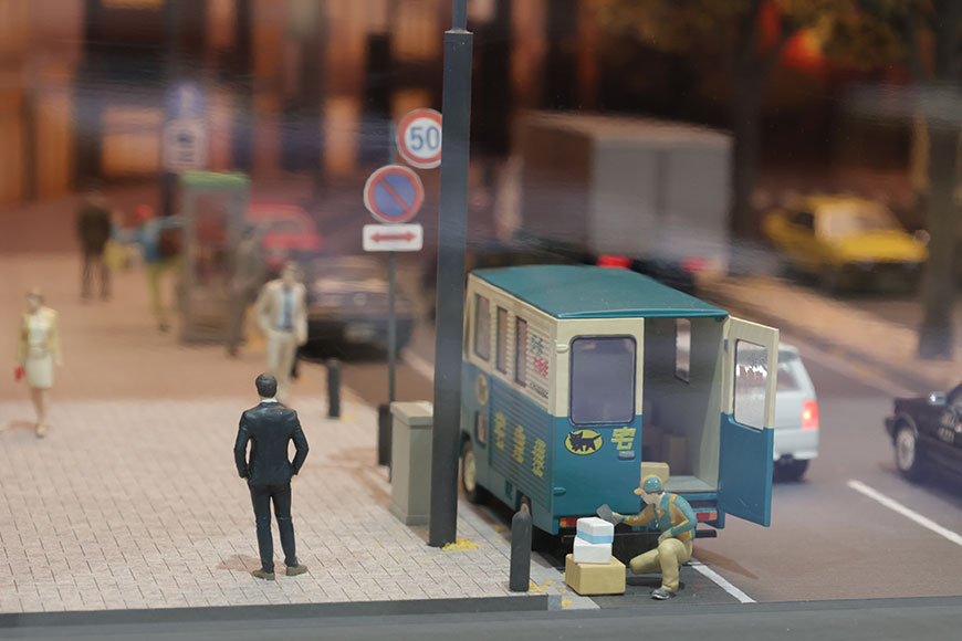 時は1980年。遠くに沈みかけた夕日によって赤く染まるビルたちと、そこを行きかう人々を描いています。黄色くなったイチョウの落ち葉が風で舞う中、配送業者はデンソー製のバーコード読み取り機を使い荷物を仕分けています。カーナビが普及する前の時代を象徴するように、反対車線では若者がボンネットに地図を広げ、友人を待ちながら目的地を確認しています。ビルの中では自動水洗を利用するサラリーマンの姿も。