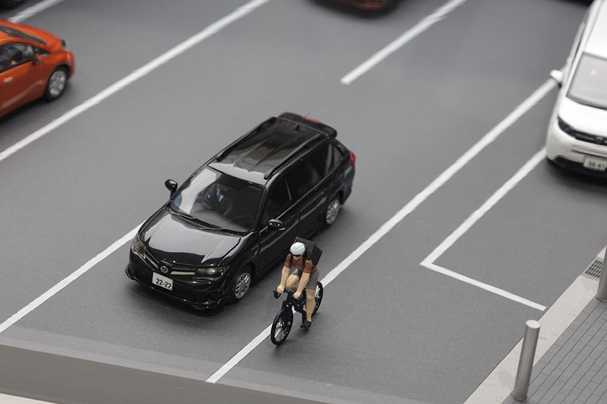 建物や小物はアクリルや3Dプリンターなどですべてオリジナルで一から制作。車両についても、市販品では入手できない約半数をデータ作成・成形・塗装まで行い、当時のディテールを忠実に再現しました。